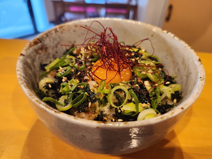 ごはんと焼肉に合うたれ、韓国のり、ネギなどと卵黄をのせてご提供しております。